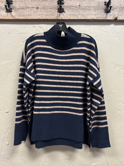 Description : Crafted from a rich blend of acrylic, polyester, and camel, the mock neck tunic in navy taupe stripes offers a luxurious feel and a striking look. The striped pattern is both bold and sophisticated, while the mock neck and tunic length provide warmth and coverage. Perfect for pairing with leggings or slim pants.