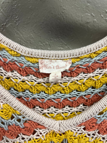 Description : Perfect for transitioning into fall, this open knit cropped sweater has a V-neckline, long sleeves and ribbed hem and cuffs