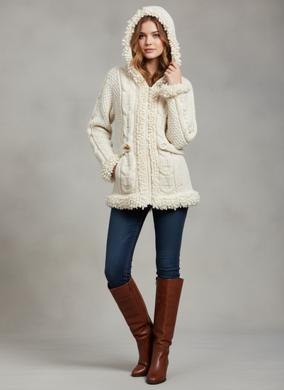 Description : Cream-colored, hooded, knit sweater jacket featuring a zipper closure, cable knit detailing, and two decorative flap pockets with button accents. The hem and cuffs have a textured fringe detail.
