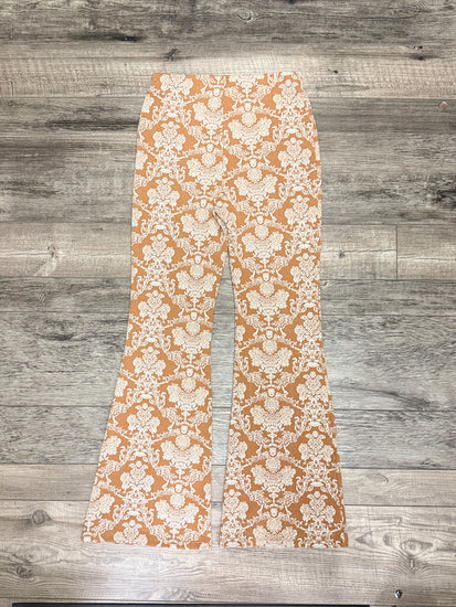 Description : Pull on bells in a warm caramel base with an all-over cream ornate damask pattern, high waist and wide flared legs