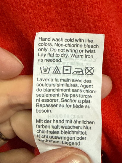 Description : Red long-sleeve turtleneck sweater with a relaxed fit, ribbed cuffs, hem and collar, and a small embroidered ELF on the left chest; textured knit fabric with a slightly longer back hem