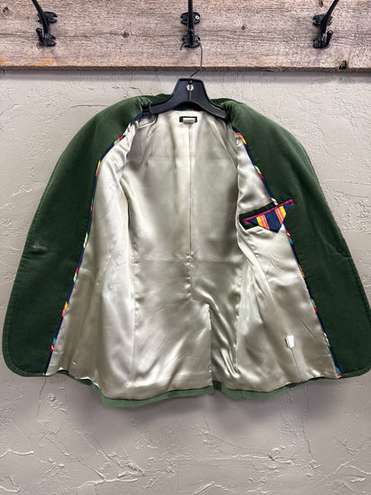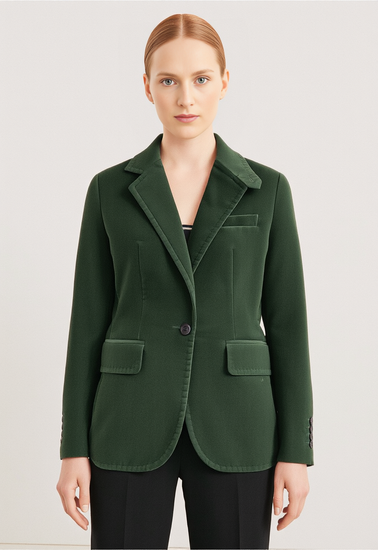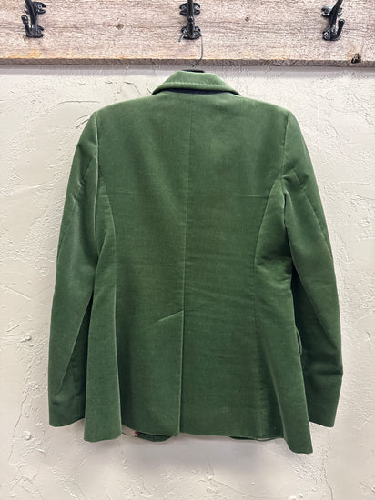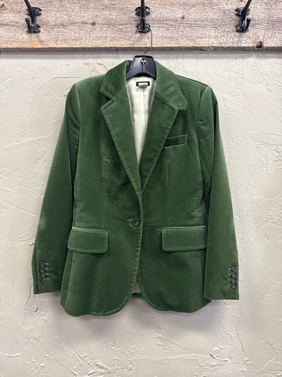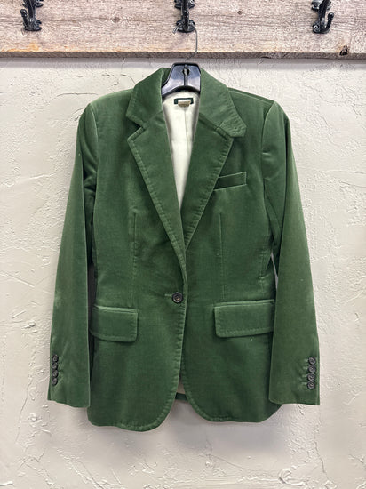 Description : Classic J. Crew, green velvet blazer featuring notched lapel collar, single button closure, two front pockets, buttoned cuffs and a structured silhouette.