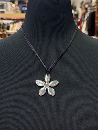 Description : J.Jill Black Cord Silver Flower Adjustable Necklace. It features a large, polished silver-tone flower pendant on an adjustable black cord with a sliding knot closure, allowing for various lengths