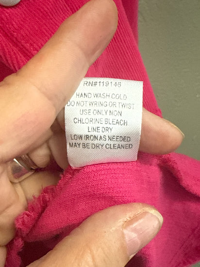 Description : Long-sleeve corduroy button-up shirt in vibrant fuchsia/magenta with silver snap buttons, two chest flap pockets, a pointed collar, and a slightly frayed hem