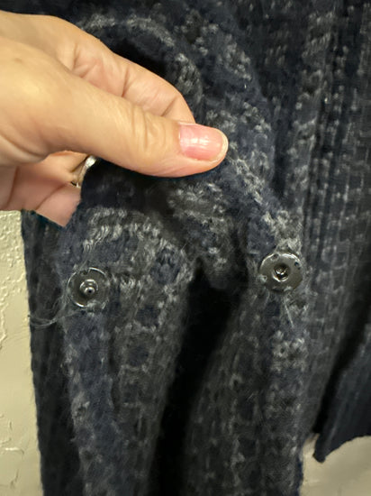 Description : Open-front wool cape in a deep navy color with a textured waffle weave, draping boxy silhouette and wide arm openings; collarless with a straight front edge and substantial weight