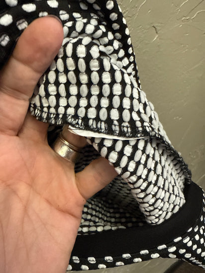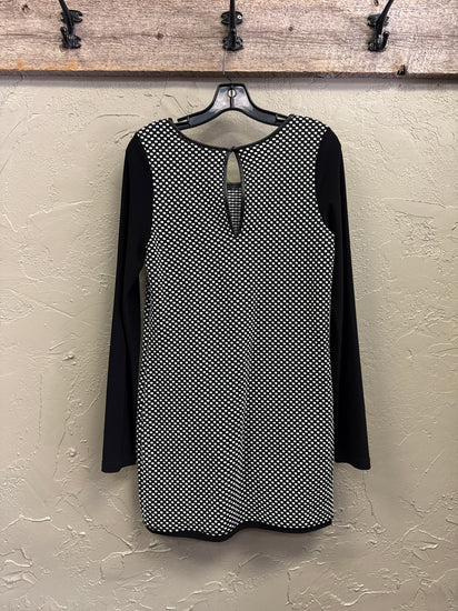 Description : Long-sleeve shift dress with a black-and-white small geometric/dot textured front panel, solid black sleeves and trim, a round neckline (keyhole at back) and two front patch pockets with black edging