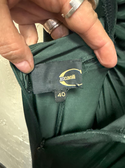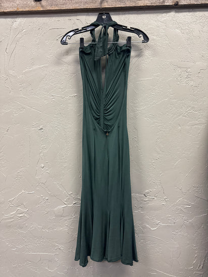 Description : A fluid romance of delicate details and a feminine silhouette. Created to fit you perfectly, this Just Cavalli midi dress in forest green has a halter neckline, ruched accents, and an open back.
