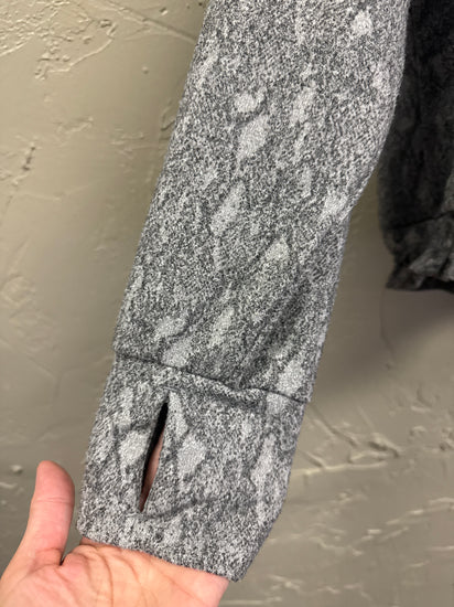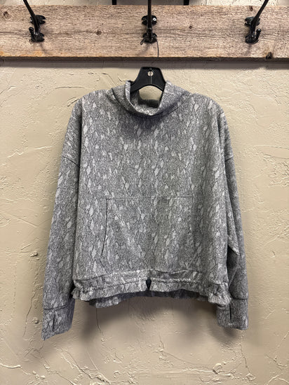 Description : Grey long-sleeve pullover with a short mock neck, front kangaroo pocket and elasticized hem, featuring a subtle textured snake-like pattern and a relaxed fit. The fabric is medium-weight with ribbed cuffs and a slightly boxy silhouette.