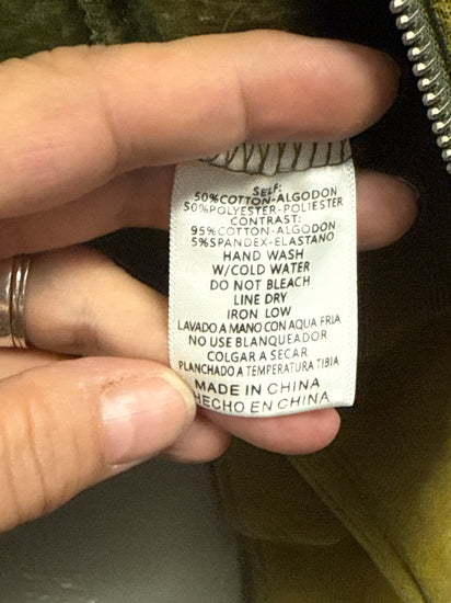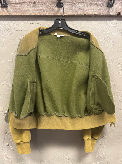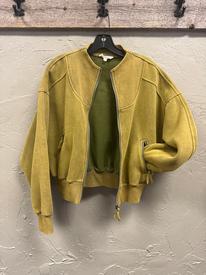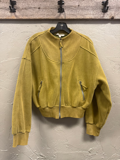 Description : Bomber-style zip-up jacket in a muted mustard-olive green with a full front metal zipper, ribbed collar, hem and cuffs, and two vertical zippered front pockets; slightly cropped with a soft, brushed fabric texture. The jacket features dropped shoulders and a relaxed, boxy fit