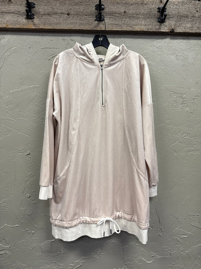 Description : Long hoodie dress in a pale beige with a half-zip front, attached hood, ribbed cuffs and hem, and a drawstring at the bottom edge. The silhouette is relaxed with dropped shoulders and a slightly oversized fit