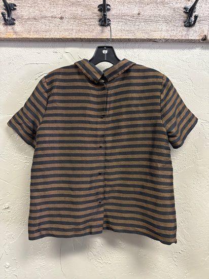 Description : Madewell black and brown striped blouse/snap button back blouse. 88% linen and 12% silk fabric gives off a fancy sheen, boxy fit.