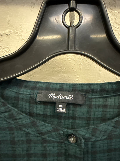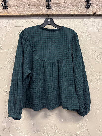 Description : In versatile plaid, this crinkly peasant-style button-front shirt has delicate buttons, a shirred yoke and balloon sleeves.
