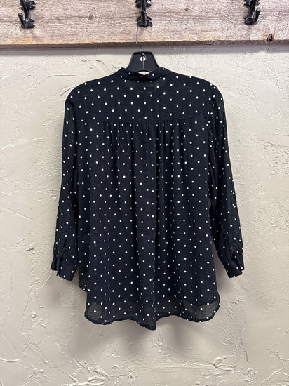 Description : Black with white polka dots in a slightly sheer, 100% cotton fabic. Features a band (mandarin) collar and a center partial button placket. The front is loose-fitting with a slightly curved hem and buttoned sleeve cuffs