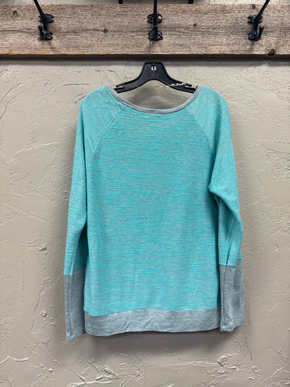 Description : Long-sleeved, crew neck top in a turquoise hue with heather grey accents at the neckline, cuffs, and hem. The main body of the shirt features a subtle textured knit.