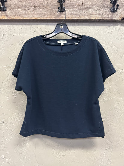 Description : Midnight blue, crew neck, short-sleeved top with subtle contrast stitching around the neckline, sleeves, and hem