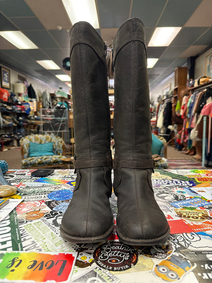 Description : Elevate your outdoor style with the MERRELL Women's Leather Tall Riding Boots. Designed to combine both fashion and function, these boots feature a sleek espresso leather upper that reaches almost to the knee, perfect for waterproofing your footwear collection. The durable rubber outsole provides excellent traction on varied terrains, while the low block heel ensures a comfortable stride throughout your day's adventures.The Buckle model boasts a versatile design, suitable for casual outings or travel, with a convenient zip closure for easy wear. Merrell's commitment to quality is evident in every stitch, ensuring that these boots are not only stylish but also built to last. Embrace the elements with these tall, elegant boots that are ready to accompany you on every journey.