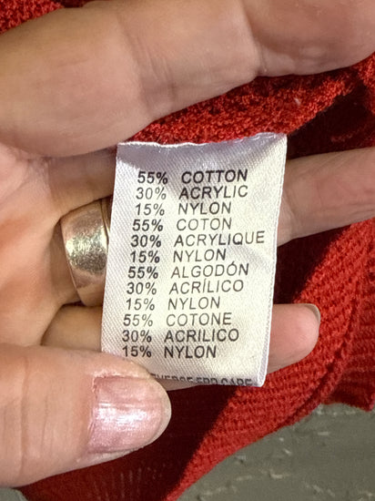 Description : Long-sleeve, relaxed-fit red knit sweater with a round neckline, ribbed cuffs and hem, and a slightly dropped shoulder silhouette. The fabric is medium-weight with a visible horizontal knit texture