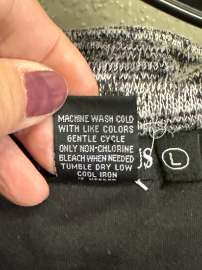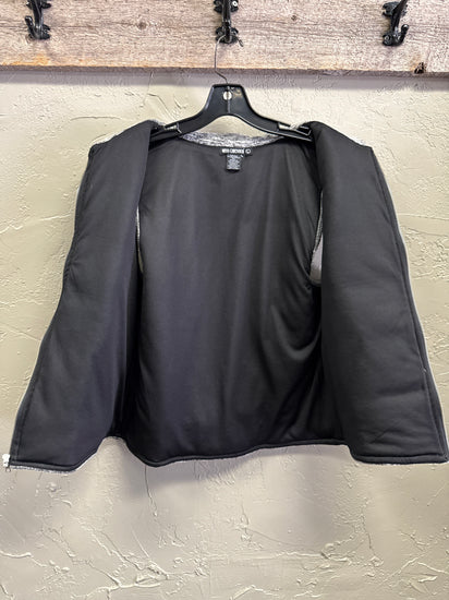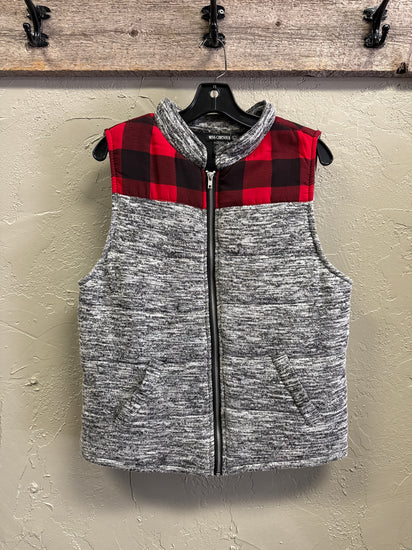 Description : Sleeveless zip-up vest with a heather gray knit body, red-and-black buffalo plaid yoke and stand collar, a central front zipper and twin welt pockets.