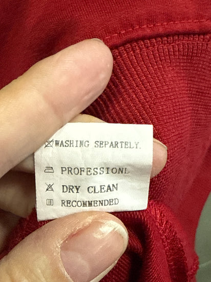 Description : Long-sleeve loose-fit pullover top in a solid bright red with a draped cowl neck, ribbed cuffs and hem, and a soft, slightly textured knit fabric.