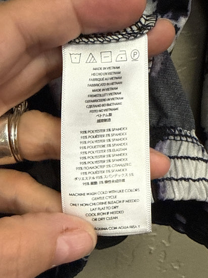 Description : Off-the-shoulder blouse in black with white and lavender abstract tie-dye splatters, featuring an elasticized neckline, a loose bodice, 3/4-length sleeves, and an elasticized hem.
