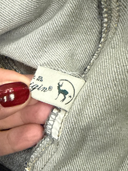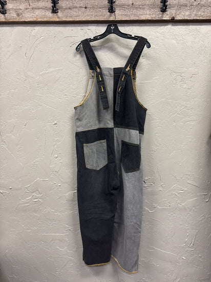 Description : Denim overalls in a two-tone design in black and light gray, featuring adjustable shoulder straps, a large square patch pocket on the right front, exposed yellow topstitching, and distressed rips on both legs. The piece has a straight-leg cut and visible contrast seams down the center