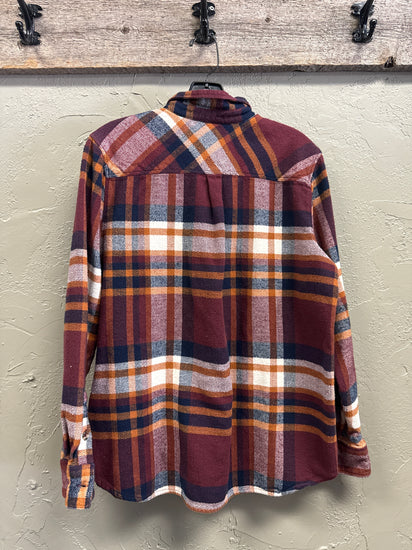Description : Plaid flannel shirt, featuring a button-up front, two chest pockets, long sleeves with buttoned cuffs, and contrasting check patterns in white and orange. The shirt has a classic collar and a slightly curved hem.