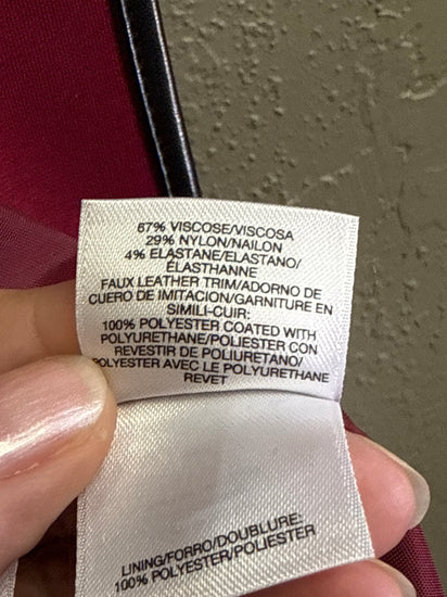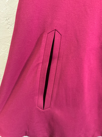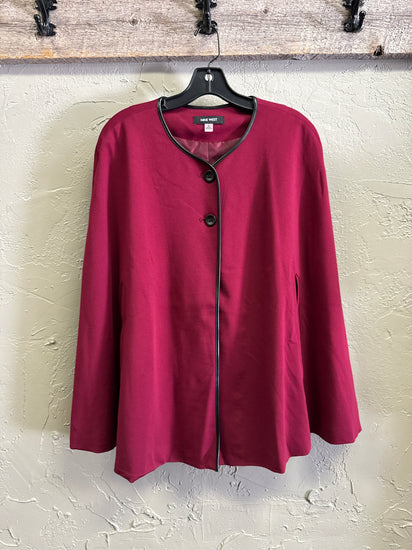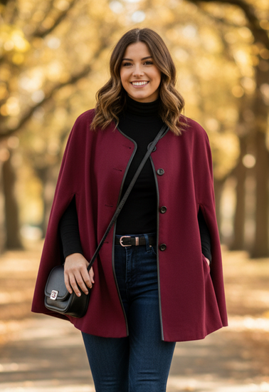 Description : A knee-to-hip length cape in a deep magenta/burgundy color with a round neckline, black piped trim along the front opening, two large black buttons at the top, welt pockets at the hips and a slightly A-line drape