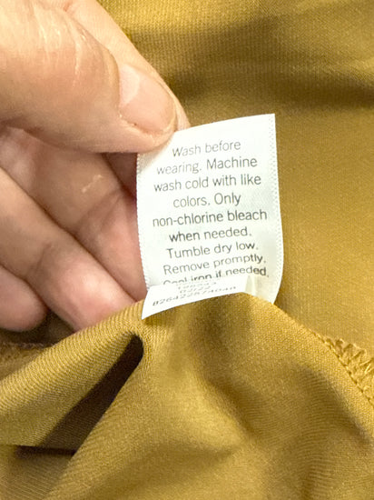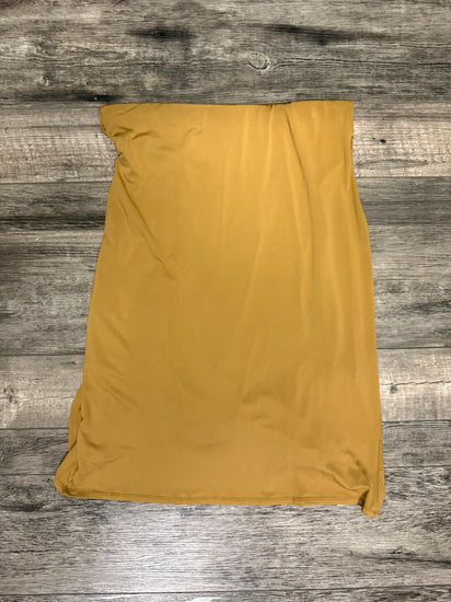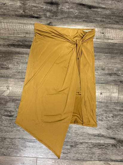 Description : Mustard yellow faux wrap skirt with a knotted tie detail at the waist and a high slit