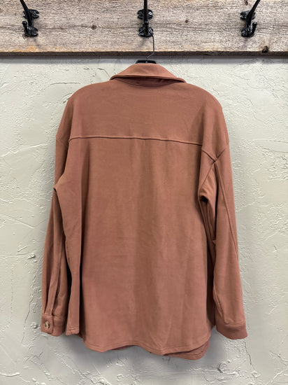 Description : Long-sleeve button-up shirt jacket in a warm cinnamon brown with a pointed collar, front button placket, two chest flap pockets with buttons, and a relaxed fit.