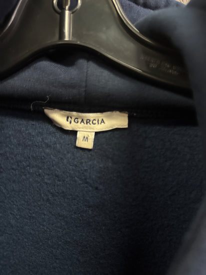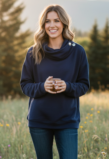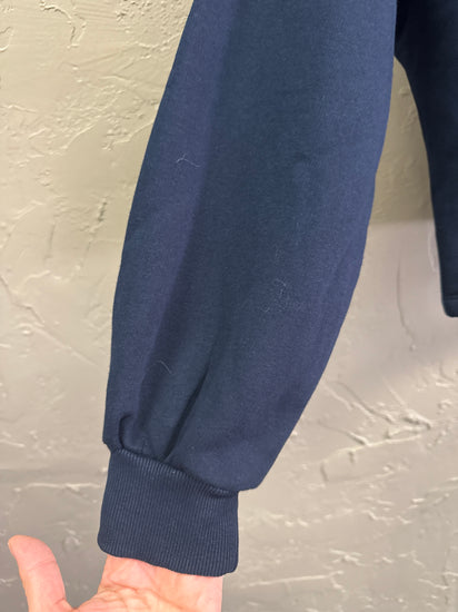 Description : New without tags long-sleeve navy sweatshirt with a relaxed fit, featuring a high funnel neck & hood; with two metallic buttons on the left shoulder and ribbed cuffs and hem.