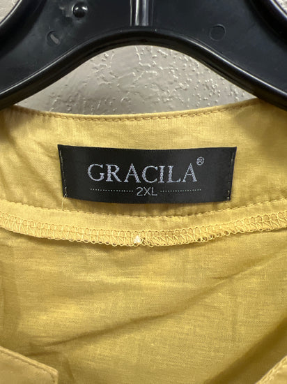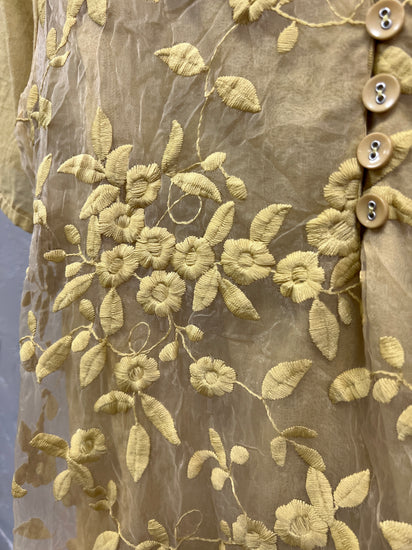 Description : New without tags, yellow short-sleeve blouse with a v-neckline, embroidered floral pattern across the front, buttons visible along the placket, slightly longer back hem, lightweight fabric with a textured appearance.