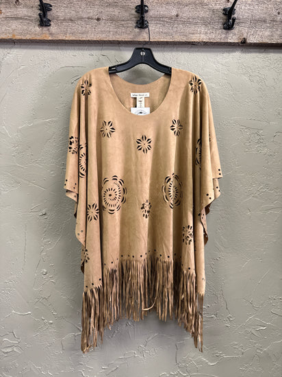 Description : New without tags, laser-cut suede-like poncho in a warm camel/tan color with a scoop neckline, scattered floral geometric cutout patterns across the front, and long fringe along the hem. It has a loose, draped fit with short wide sleeves and a soft matte texture