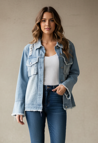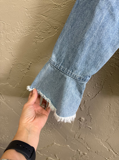 Description : New without tags, light wash distressed denim jacket with frayed trim on the collar, pocket flaps, hem and cuffs, front button closure and two chest flap pockets; sleeves have a slight bell shape.
