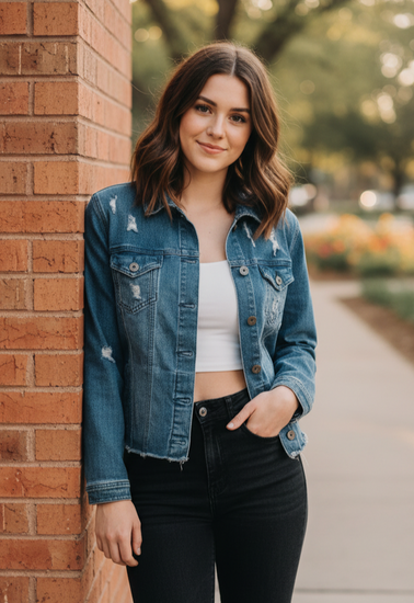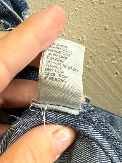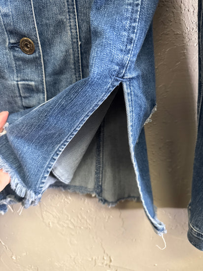 Description : New without tags, medium-wash denim jacket with a button-front closure, pointed collar, flap chest pockets and vertical seam detailing; features distressed patches and a frayed hem with side welt pockets and long sleeves
