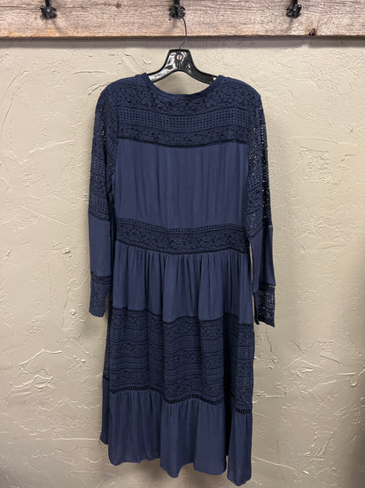Description : Beautiful long sleeve dress with textured lace detailing across the shoulders, waist, and sleeves. Tiered ruffles at the hem, flowing silhouette and round neckline.
