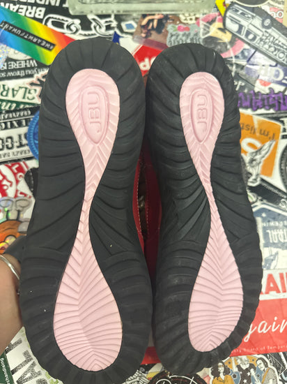 Description : These are Mary Jane style flats with a round toe and a hook-and-loop (Velcro) strap closure. They feature floral cutouts on the vamp and sides, and scalloped edges for a feminine touch