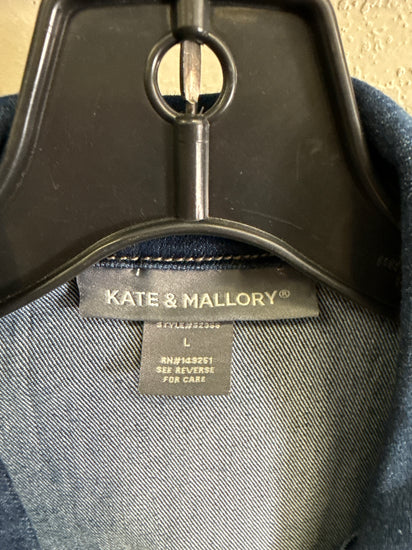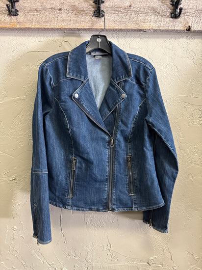 Description : New without tags, medium-dark denim moto jacket with an asymmetrical front zipper, wide notched lapels with snap details, vertical zippered front pockets, visible seam topstitching, and long sleeves