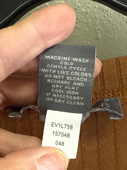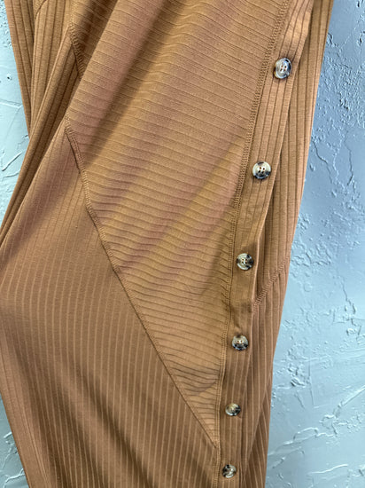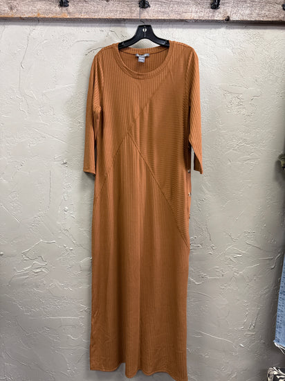Description : New without tags, full-length, long-sleeve ribbed knit dress in a warm camel with a round neckline and diagonal seam detailing across the front; three-quarter sleeves and a slim, straight silhouette with side button accents.
