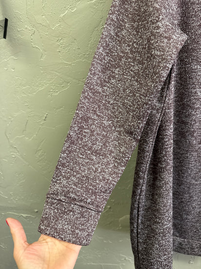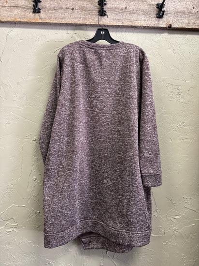 Description : New without tags, long-sleeve fleece-type dress in a heathered muted mauve with a crew neckline and relaxed A-line silhouette. Textured knit surface, cuffed sleeves and an off-center short zipper detail at the hem for subtle asymmetry