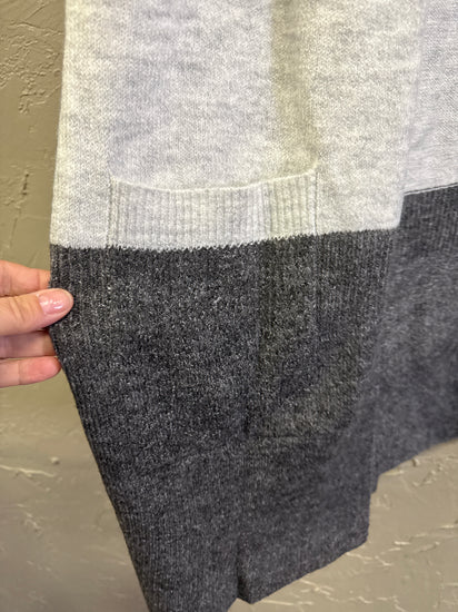 Description : New without tags, long open-front knit cardigan sweater featuring front patch pockets and ribbed cuffs and hem. The fabric is medium-weight and soft with a relaxed, draped fit.