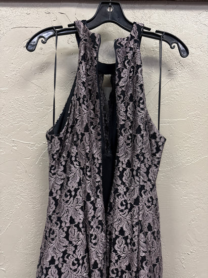 Description : New without tags halter-style sleeveless dress with a high neckline and small keyhole, featuring a black base overlaid with silver-lilac floral lace, a defined waist and a flared A-line skirt, visible zipper at the back