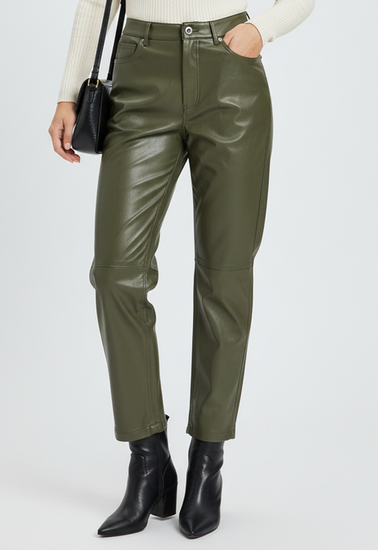 Description : New without tags, high-waisted straight-leg faux leather pants in a muted olive green with a button-and-zip closure, belt loops, front pockets, and visible seam detailing down the legs.