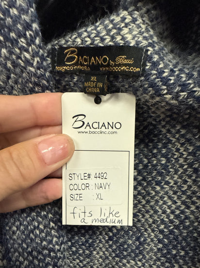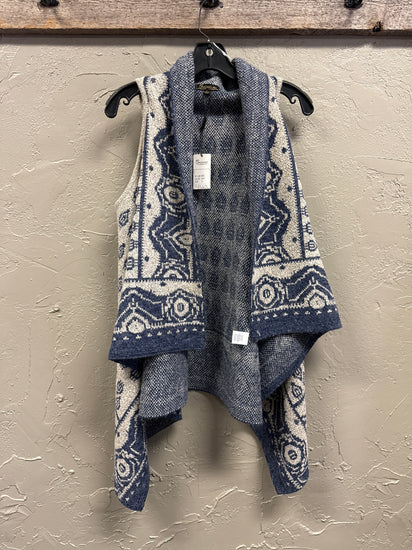 Description : New with tags knitted vest with an open, draped front. Predominantly cream color with blue intricate geometric patterns and designed for layering. Sized XL but fits more like a medium.