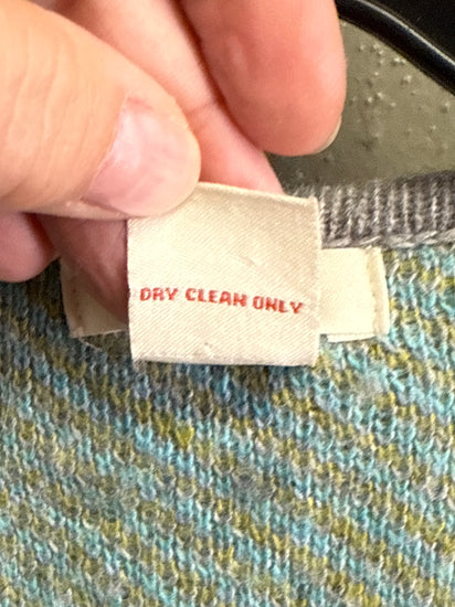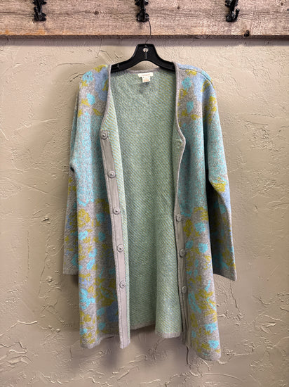 Description : Knee-length knitted cardigan/coat in a heathered grey base with a muted floral jacquard in aqua, light blue and chartreuse; features a 5 button closure, long sleeves, and a soft, textured wool-like fabric. Front is straight-cut with a simple open placket and subtle contrast trim along the opening.
