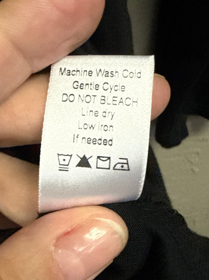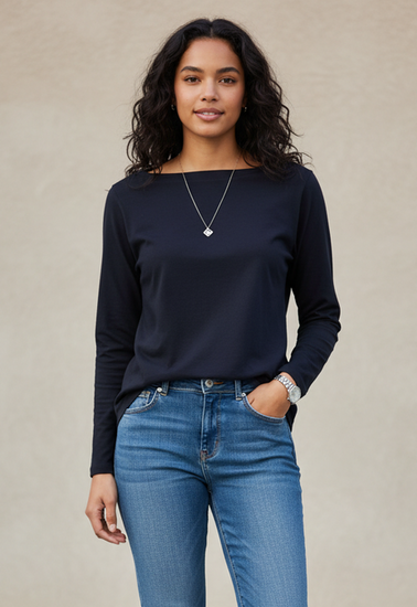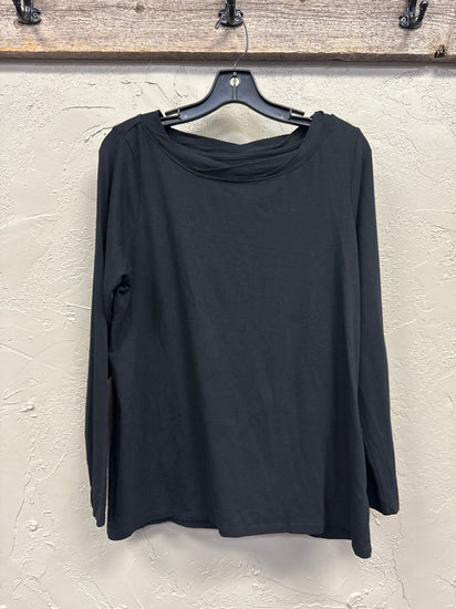 Description : New with tags long-sleeve black knit top with a slightly draped boat neckline and a straight, relaxed fit viewed from the front.