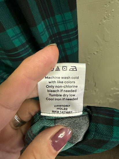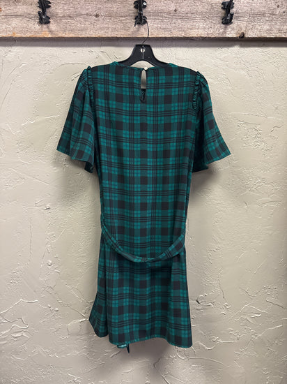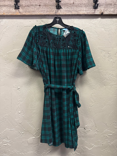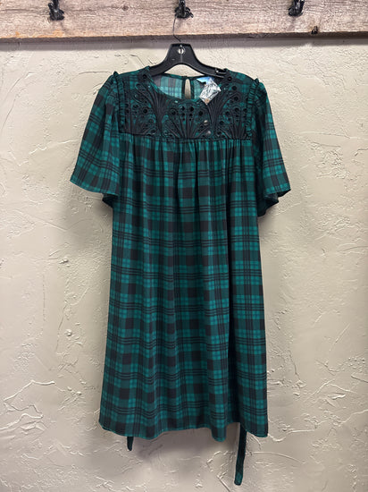 Description : New with tags, knee-length dress in a dark emerald and black plaid with a round neckline featuring a black embroidered eyelet yoke, short flutter sleeves, and a self-tie waist belt.