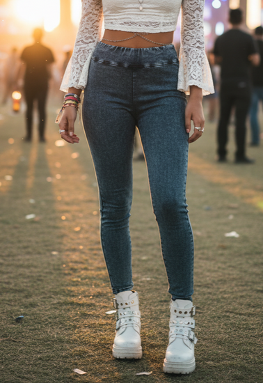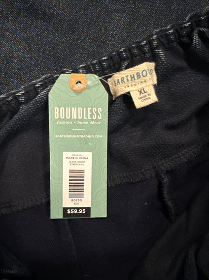Description : New with tags, pair of dark indigo denim-look leggings with a high elastic waistband and visible side seams, featuring a slim, tapered leg and subtle washed texture on the front.