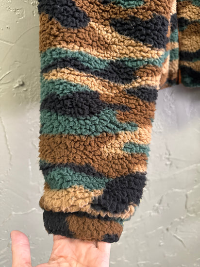 Description : New with tags plush sherpa zip-up jacket in a camouflage print featuring warm browns, deep green, tan and black; it has a stand collar, full front zipper and slit hand pockets. The textured fleece fabric gives a cozy, structured silhouette with long sleeves and a slightly cropped hem.