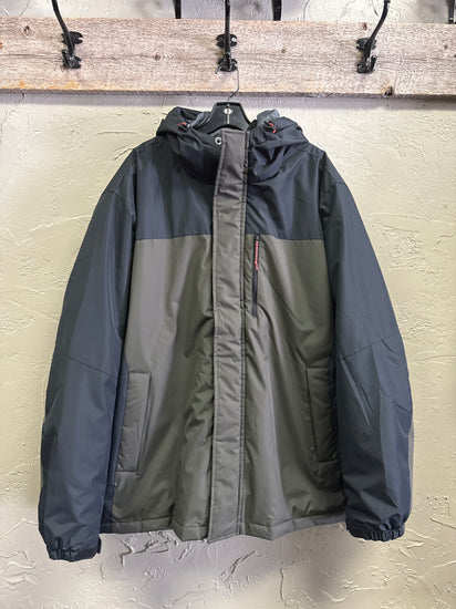 Description : Men's hooded coat in a two-tone design with black upper and sleeves and an olive-gray body, featuring a full-length front zipper with storm flap, a vertical chest zip pocket, two hand pockets, and elasticated cuffs. The coat has a high collar integrated with the hood and a slightly padded, weather-resistant fabric.