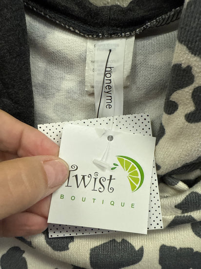 Description : New with tags long-sleeve hooded top in white and charcoal featuring a gray-black leopard print across the upper body and sleeves with a solid charcoal lower body and cuffed sleeves, relaxed fit and curved hem
